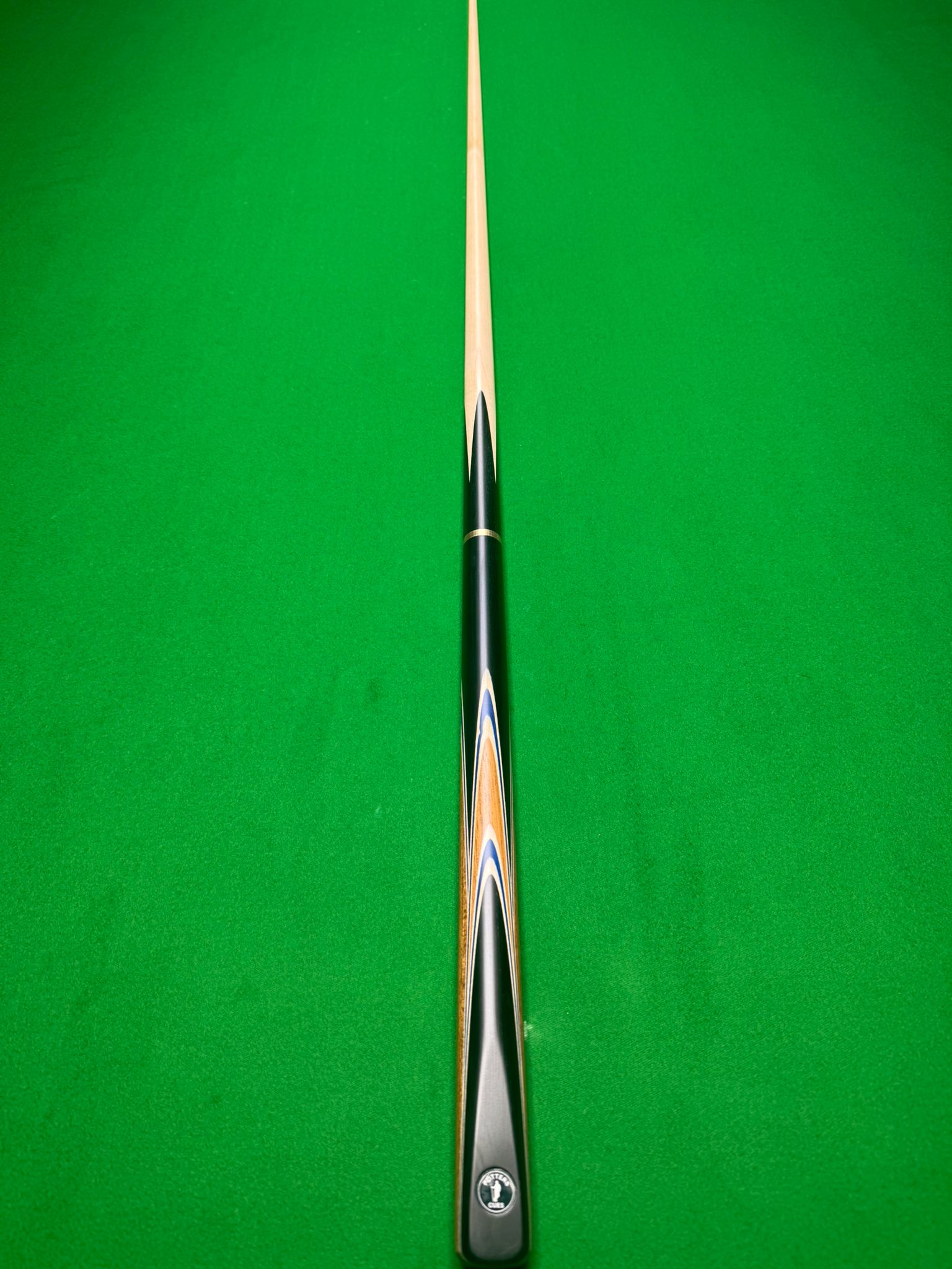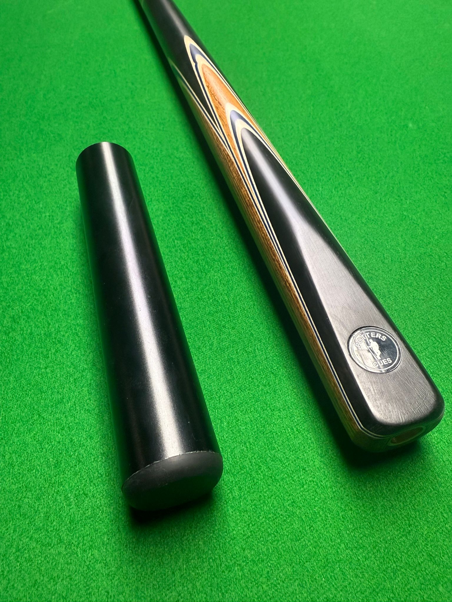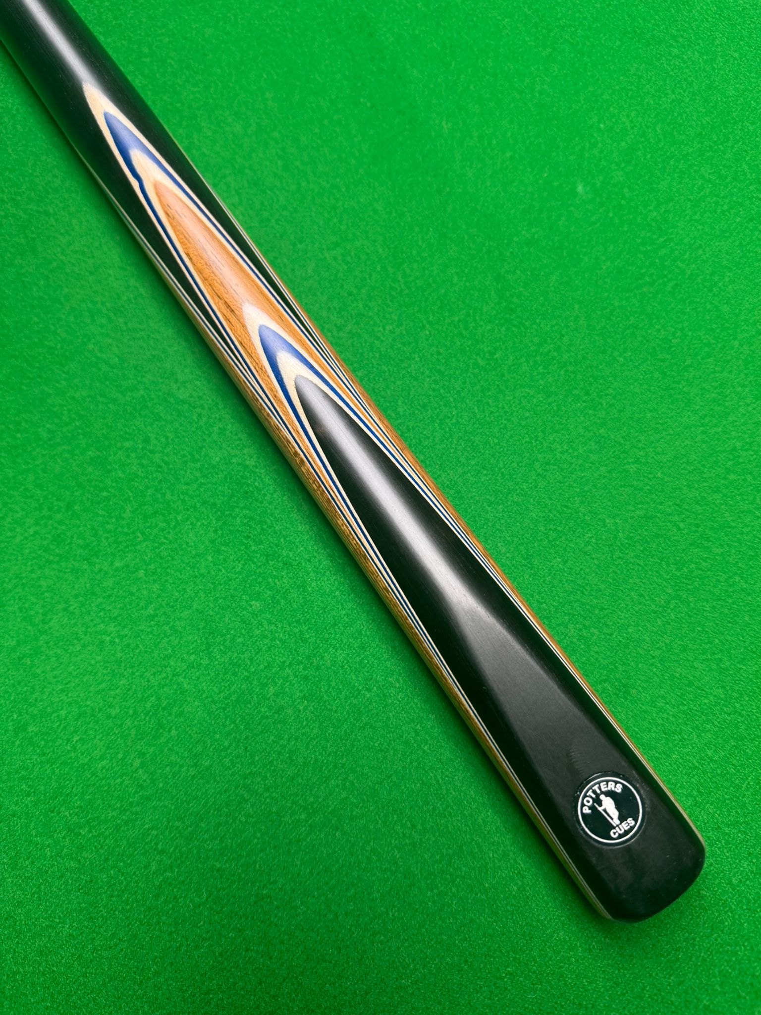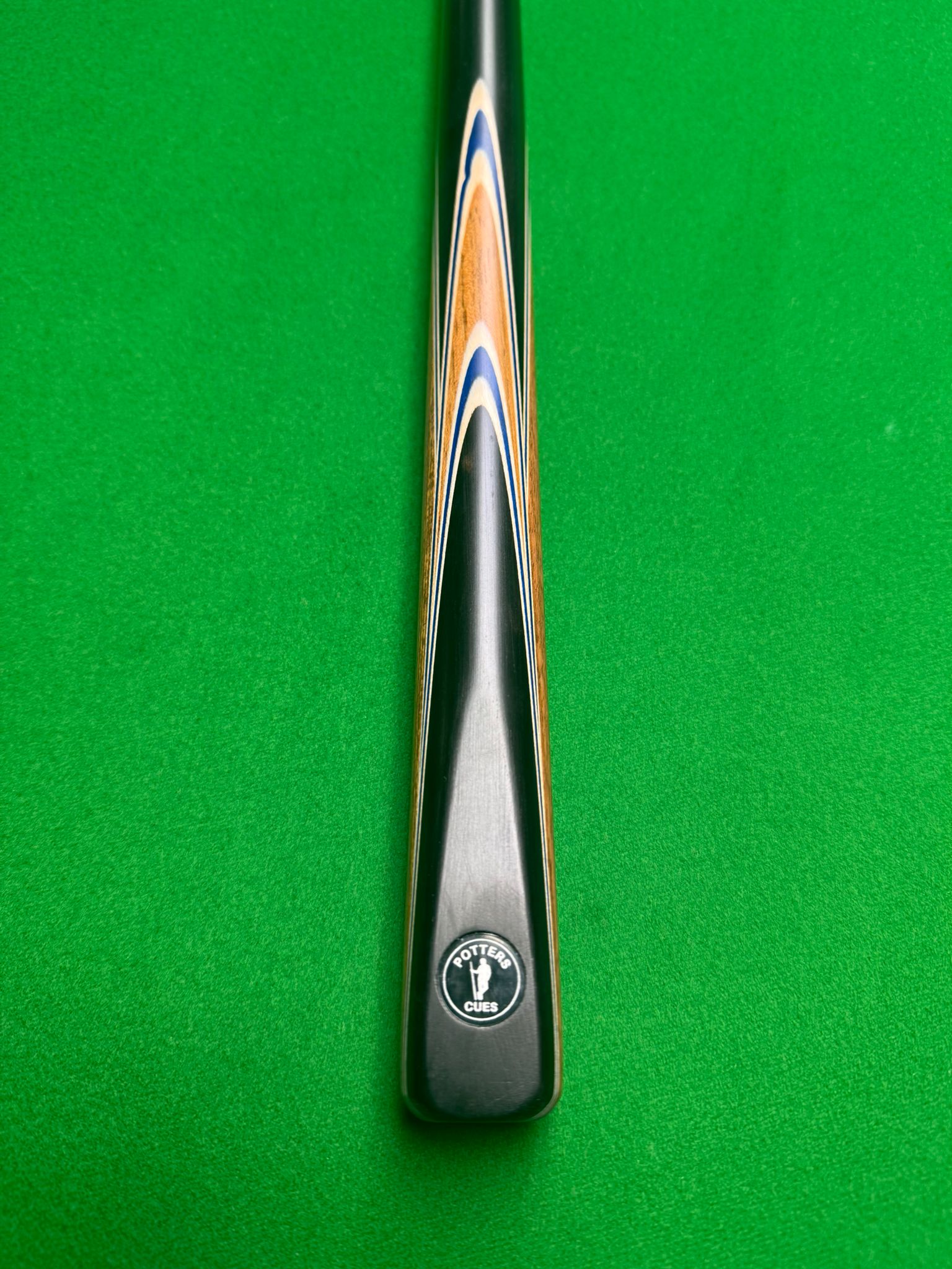 Potters 3/4 Maple Cue – Blue, Brown, Black & White : Length 57″, Tip 8.5mm, Weight 18.5 oz | 3/4 Spliced Maple Cue with 6 inch Mini Butt