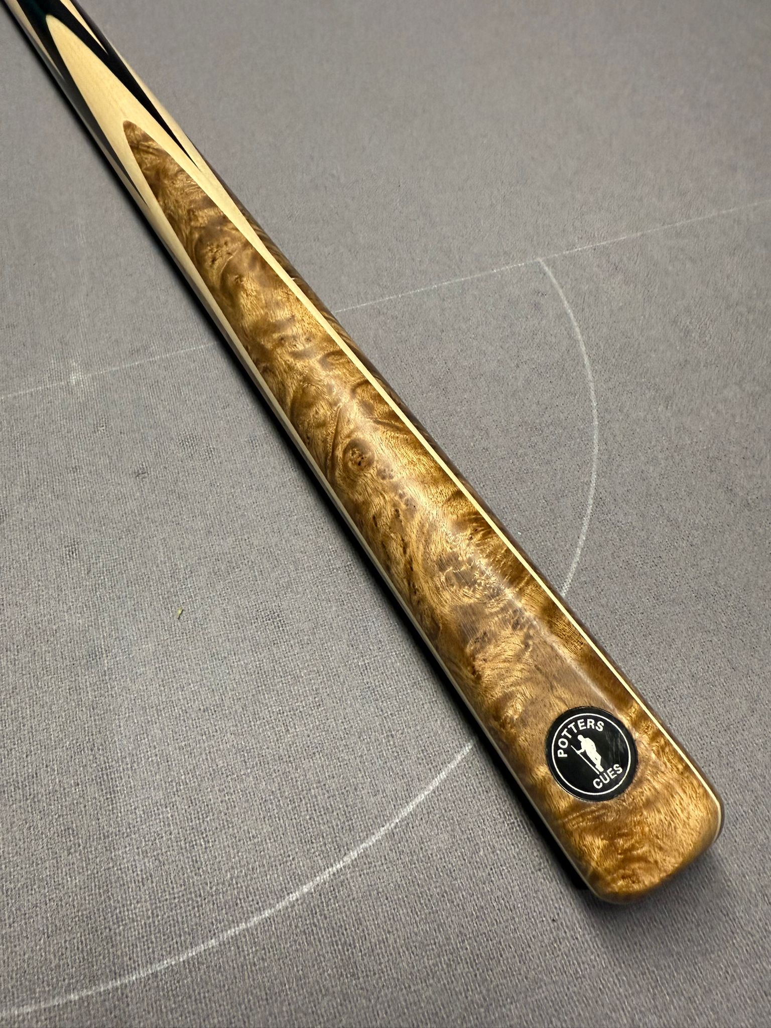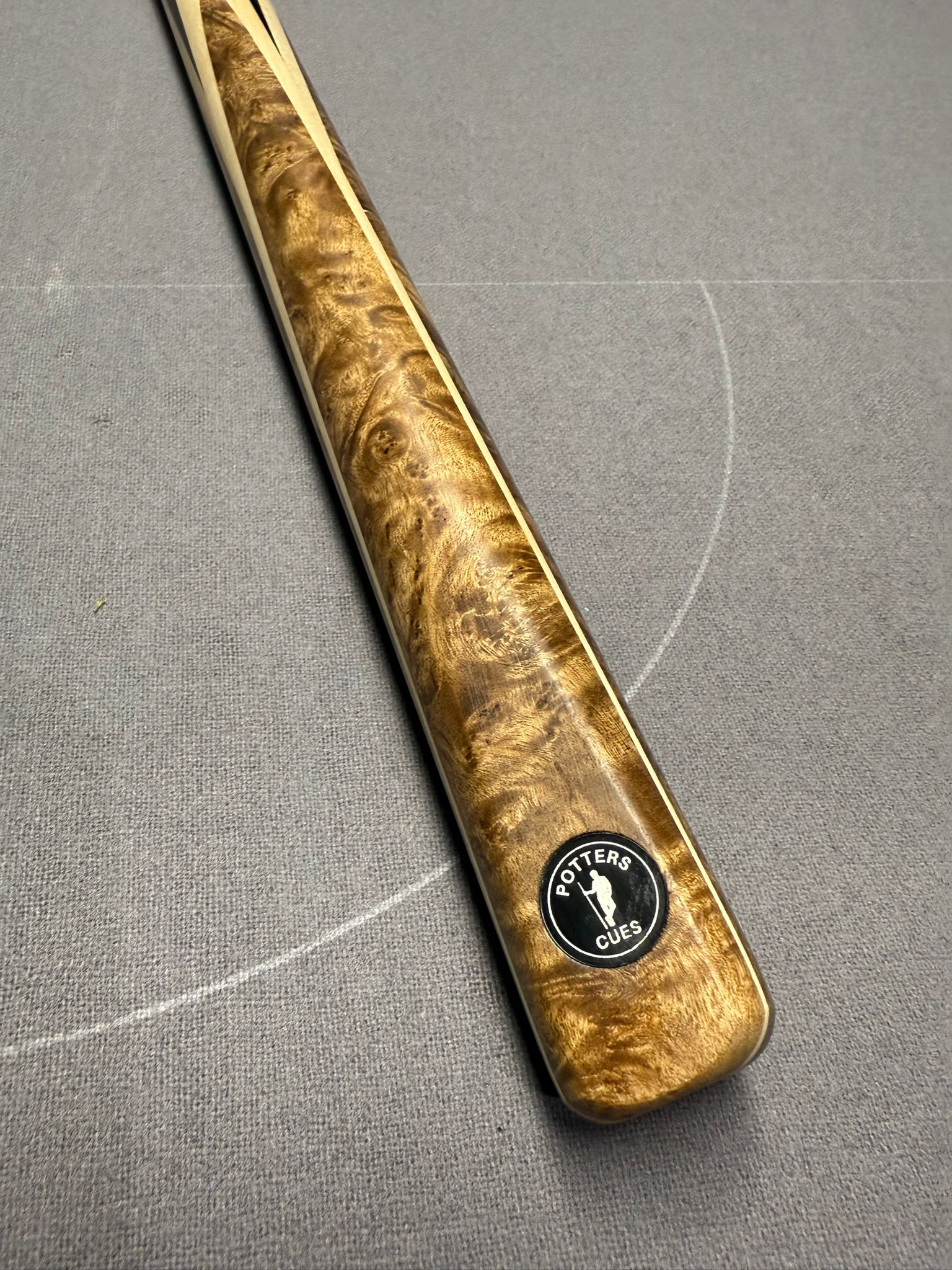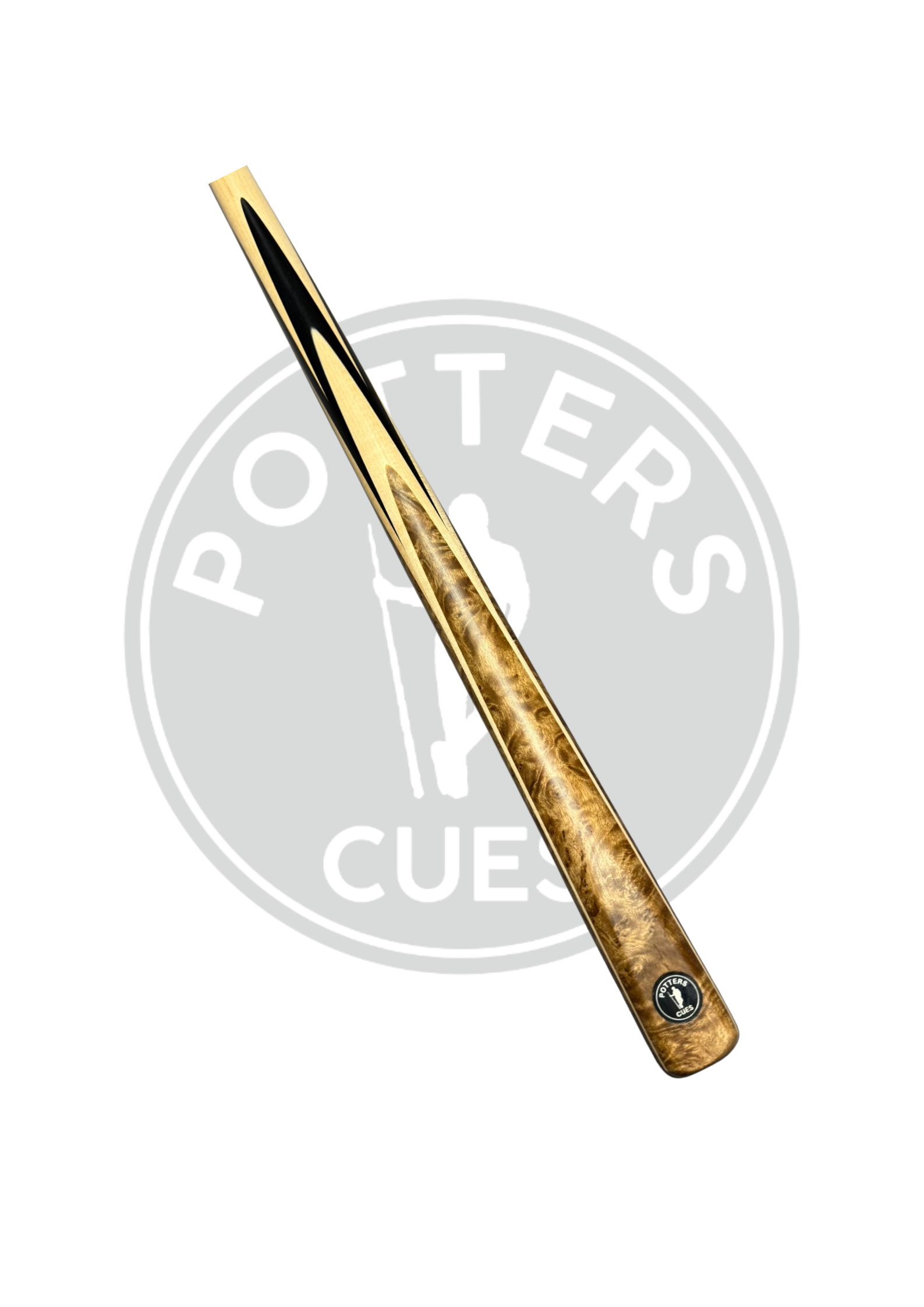 Potters Maple 1 Piece Cue: Length 57.5”, Tip 9.5mm, Weight 18.5oz. 1 Piece Spliced Maple Cue with 6 inch Mini Butt
