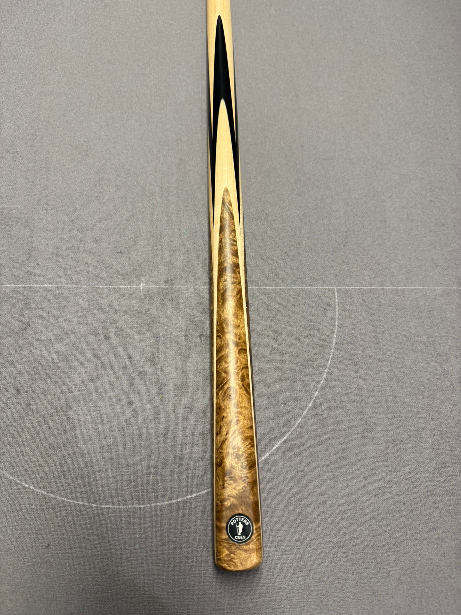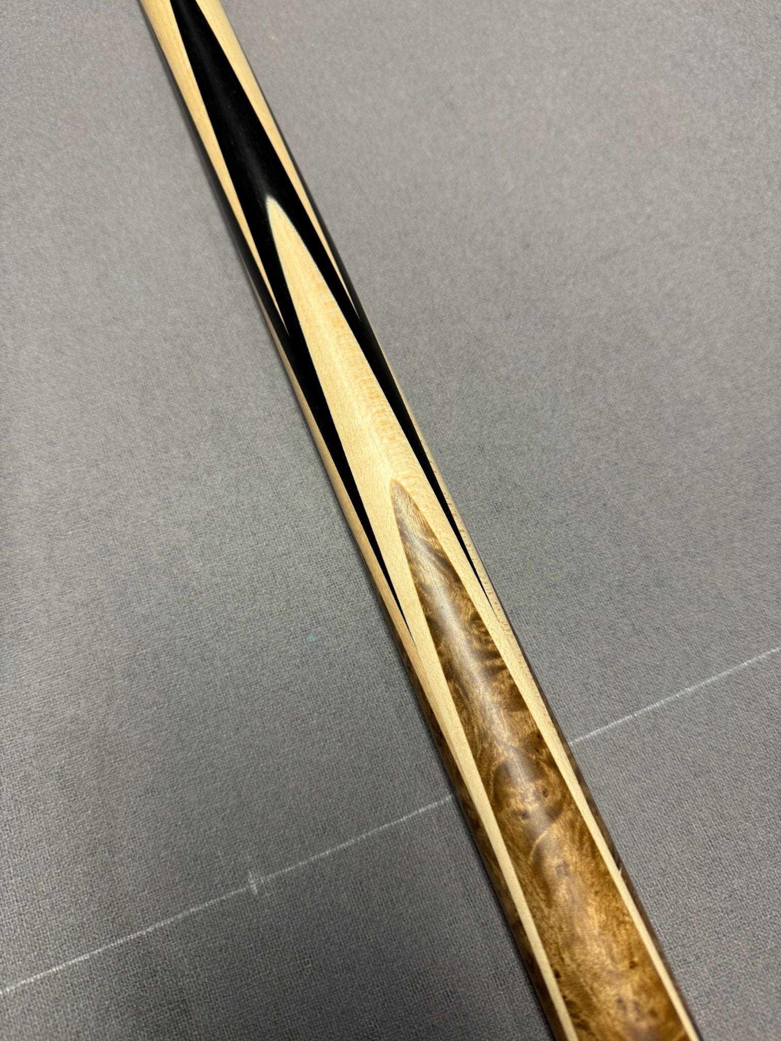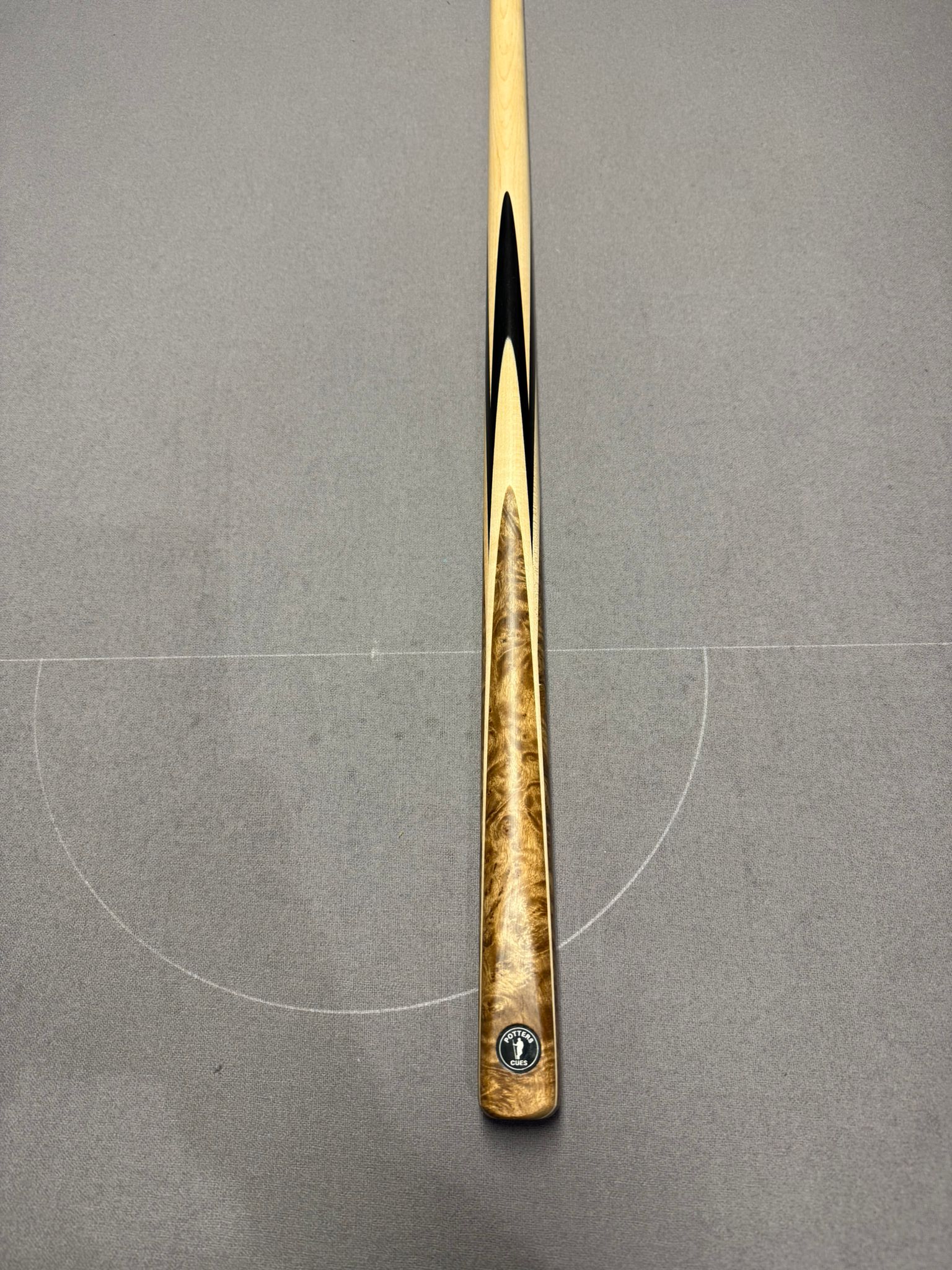 Potters Maple 1 Piece Cue: Length 57.5”, Tip 9.5mm, Weight 18.5oz. 1 Piece Spliced Maple Cue with 6 inch Mini Butt